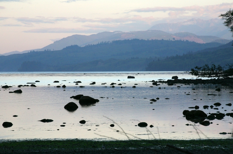 Unser einsamer Übernachtungsplatz an der Straße von Juan de Fuca, zwischen Vancouver Island und Washington, zaubert uns noch eine schöne Abendstimmung. Am nächsten Morgen ist es ziemlich nebelig. Es hat also wenig Sinn, zum Cape Flattery hinaus zu fahren, um Seehunde oder Wale zu beobachten. So entschließen wir uns, weiter zu fahren über den Twilight-Ort "Forks". Zumindest wurde das Buch für den Ort Forks erdacht und man schlachtet das hier ganz ordentlich aus. Grund war die enorme Regenmenge, die hier niedergeht. In diesem Jahr zeigt die Skala schon gut sechs Fuß (also etwa 1830 mm) und es ist erst Anfang September. Gefilmt wurde dann allerdings aus Kostengründen überwiegend in Oregon.