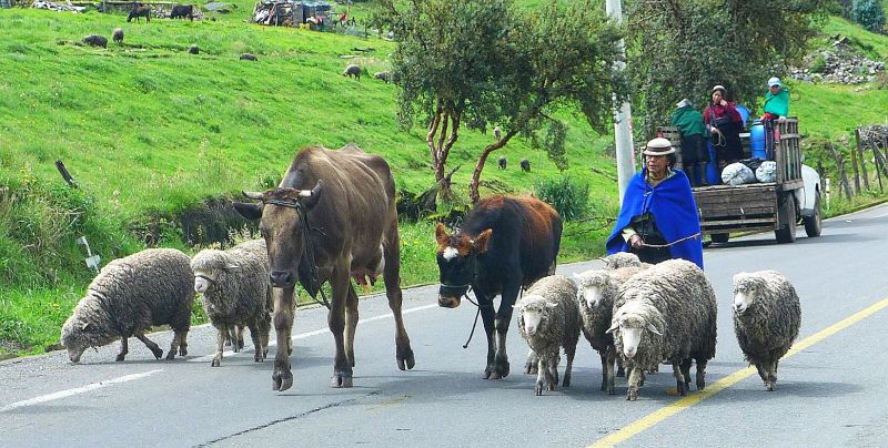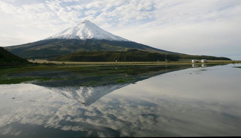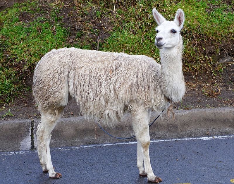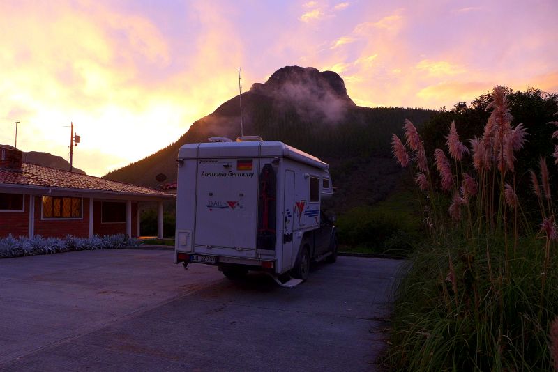 Wir fahren ein wenig weiter südlich zum Chimburazo, mit seinen 6268 Metern (er wurde früher mit 6310 Metern angegeben) dem höchsten Vulkan Ecuadors. Bei der Vulkanumfahrung nehmen wir schon am Nachmittag unseren Übernachtungsplatz auf 4057 Metern Höhe ein und genießen die wolkenfreien Abschnitte. Wir blicken auf den nochmal 2200 Meter höher gelegenen, eisbedeckten Ort, an dem die geringste Fallbeschleunigung auf der gesamten Erdoberfläche wirkt. Außerdem freuen wir uns abends darüber, dass unsere Dieselheizung auch auf dieser Höhe einwandfrei funktioniert! Zum Frühstück begrüßt uns in diesem Hochland eine Alpaka-Herde.