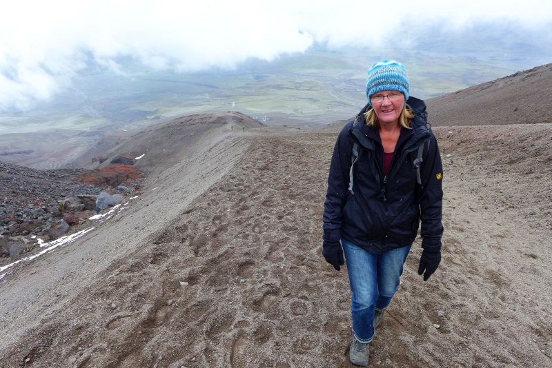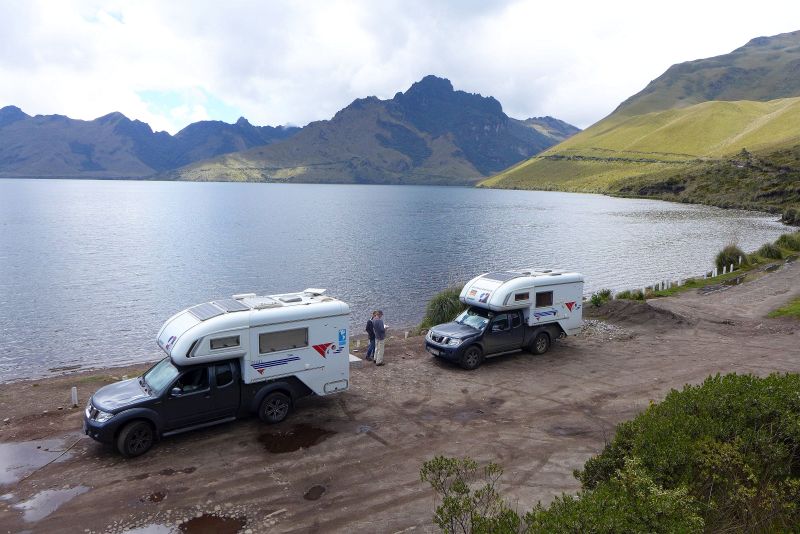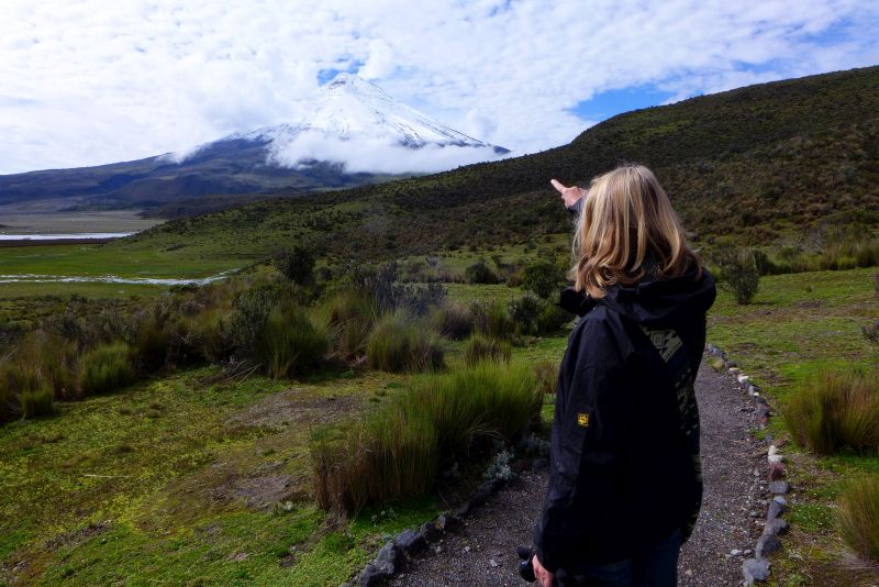 Der Cotopaxi ist unserer Meinung nach der bisher schönste Vulkan überhaupt, jedenfalls wenn man ihn sehen kann. Mit dem Auto fahren wir hinauf auf 4632m, wobei die letzten Kilometer richtig schlecht und steil sind. Ein Equadorianer ist zurecht sehr stolz darauf, seinen Peugeot 504 von 1974 hier hinauf bekommen zu haben. Allerdings musste seine Familie die letzten vier Kilometer zu Fuß gehen ;-) . Wir wandern hinauf zur Schutzhütte auf 4864m, und sind nun 50 Meter höher als der Gipfel des Montblanc. Außerdem sind wir hier durch die Äquatorlage weiter vom Erdmittelpunkt entfernt, als stünden wir auf dem Mount Everest! Wir sind früh genug, um noch einen schönen Blick auf den Gipfel zu haben, denn nachmittags wird es meist schlechter. Beim Abstieg ziehen dichte Wolken auf und wir beginnen die Fahrt hinunter ins Tal bei wenigen Metern Sicht in Schleichfahrt. Unterwegs treffen wir auf Geli und Jürgen, die vor der Weiterfahrt auf bessere Sicht warten wollen. Wir übernachten unten an einem See, der Laguna Limpiopungo., von wo aus man thoretisch eine gute Sicht auf den Vulkkankegel haben kann. Der Morgen begrüßt uns zunächst mit Tiefnebel, wenn man das auf 3850 Metern so sagen darf. Doch dann klart es ganz schnell auf und der Cotopaxi zeigt sich von seiner besten Seite. Welch ein Anblick! Dass er noch aktiv ist, kann man an seinen Rauchwolken gut sehen. Sein letzter Ausbruch war erst im Jahr 2015.