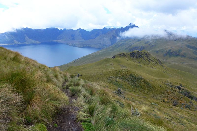 Zusammen mit Geli und Jürgen fahren wir hinauf zur Laguna Mojanda, einem Lagunensee vulkanischer Entstehung. Wir wandern hinauf zum erloschenen Vulkan "Fuja Fuja". Wir sind zwar nicht wirklich aklimatisiert, brauchen aber trotzdem für die 550 Höhenmeter nur zwei Stunden. Oben wird es nach einer Gipfelrast ziemlich nebelig und es wird Zeit zum Anstieg. Es bleiben traumhafte Ausblicke auf den Kratersee und die Paramolandschaft unter uns.