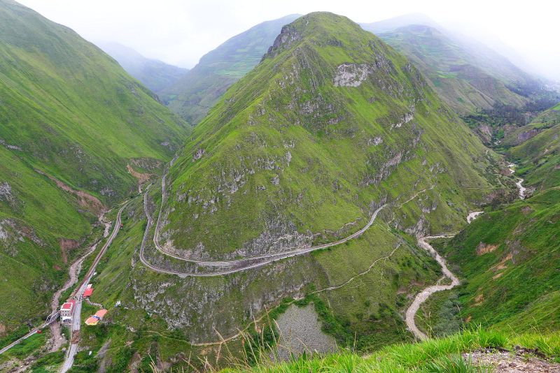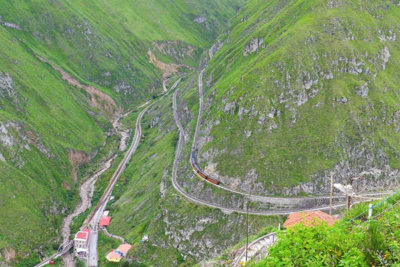 Wieder auf der Hauptroute E35 in Richtung Süden stellen wir fest, dass die Straßen in Südecuador nicht überall optimal sind. Schlaglöcher, Erdrutsche und Steine auf der Fahrbahn lenken von der fantastischen Landschaft ab. Grün, weich und trotzdem schroff zeigen sich die Berge. An den unmöglichsten Steillagen wird Ackerbau betrieben, Handarbeit macht es möglich. Im Haupttal hat man auch die im 19ten Jahrhundert geschaffene Eisenbahnstrecke als Touristenzug zwischen Durango und Quito wieder aufleben lassen. Am "Nariz del Diablo", also der Teufelsnase, hat man sich zur Überwindung der Höhe eine besondere Raffinesse einfallen lassen. Der Zug fährt vorwärts hinauf in ein totes Gleis, dann rückwärts hinauf in ein weiteres totes Gleis, um dann in größerer Höhe die Steigungsfahrt ins Tal hinauf fortzusetzen. Wir haben das Glück zur richtigen Zeit hier zu sein und können vom Mirador aus das Schauspiel ansehen.