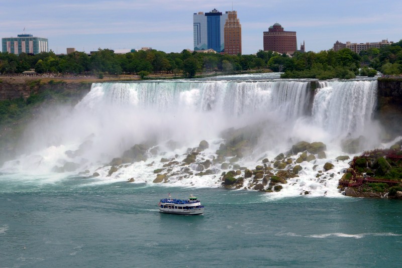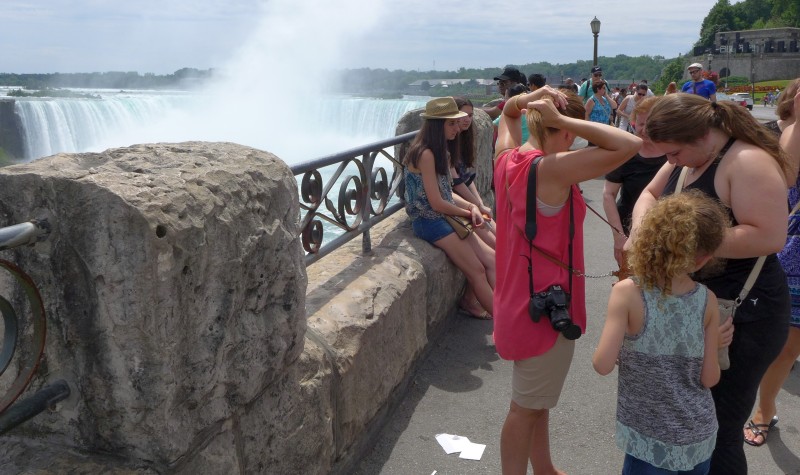 Dann angekommen und entgegen unserer Befürchtung gleich 500 Meter von den Fällen entfert einen kostenlosen Parkplatz ohne Beschränkungen bekommen. Das erwartete Grummel blieb weitgehend aus. Nut diekt an der Abbruchkante am Infocenter, etwa da, wo die Menschen den Bussen entkommen, da wurde es etwas voller, aber auch das hielt sich in Grenzen. Und es ist ein Sonntag im Juli! Möglicherweise ist der Rummel auf der US-Amerikanischen Seite größer. Dafür ist das Licht und der Blick von der kanadischen Seite mit Sicherheit lohnender!