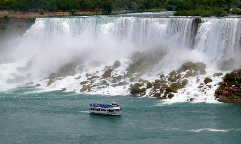 Unten im Kessel werden abwechselnd blaue und rote Regenponchos eingenässt! USA und Kanada wechseln sich mit der bezahlten Brause in der Gischt ab.