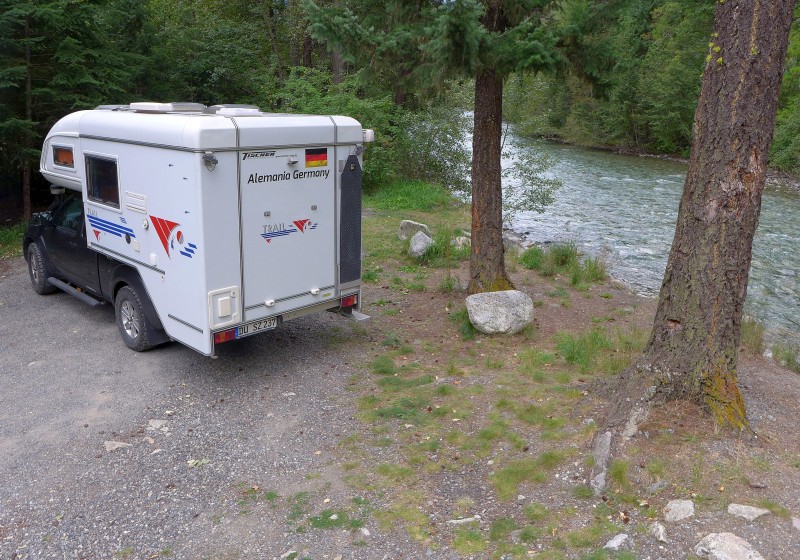 Nachdem wir in der Gegend um Kitwanga herum genug kunstvoll hergestellte Totempfähle gesehen haben, wenden wir uns zunächst den vielen Flüssen zu. Es wimmelt und zappelt überall von Lachsen und gelegentlich findet ein Exemplar den Weg zu und in die Pfanne (über den Umweg eines Fachhandels). Auch die rötlichen Sockeyes sind hier keine Seltenheit. Einzelne Flüsse verbergen die Fische im sedimentgetrübten Wasser, andere sind kristallklar. Im Fraser River wurden schon bis zu 6 Meter lange und 400 kg schwere Störe gesichtet. Da wir das aus unterschiedlichen Quellen haben, gehen wir mal davon aus, dass es sich nicht um reines Anglerlatein handelt, sondern um wissenschaftlich belegte Legenden ;-)