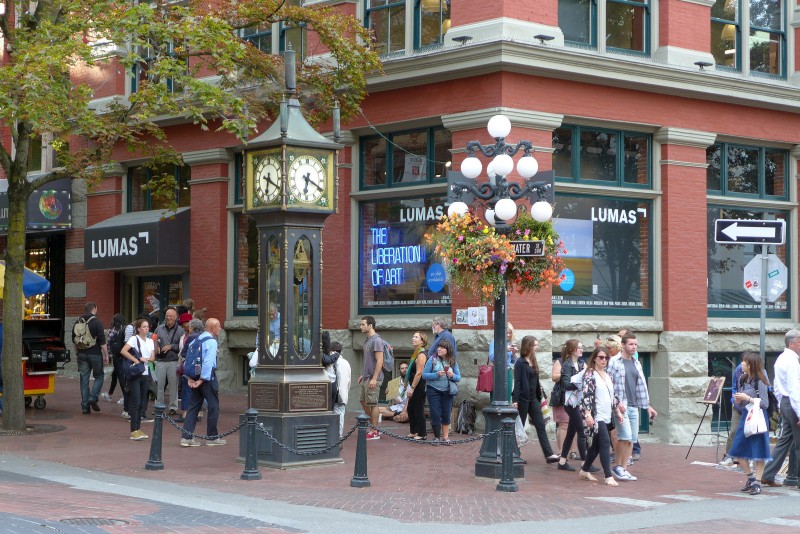 Vancouver empfängt uns am späten Nachmittag mit einem eher europäischen Fahrstil, den wir in dieser Hast gar nicht mehr gewohnt sind. Den Besuch der Stadt (auch ungewohnt viele Menschen) beschränken wir auf Downtown und Gastown, wo schöne alte Häuser neben den Wolkenkratzern bestehen. Die alte Dampfuhr zieht viele Besucher an. Mit ihren sieben Kugeln und dem dampfmotorbetriebenen Aufzug lässt sie das Publikum raten, wie das wohl funktioniert. Dann bläst sie zur Viertelstunde ihre Melodie.