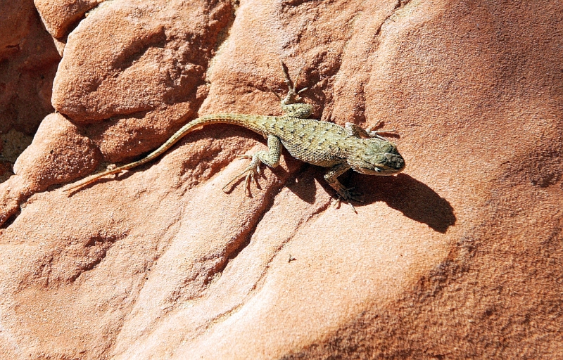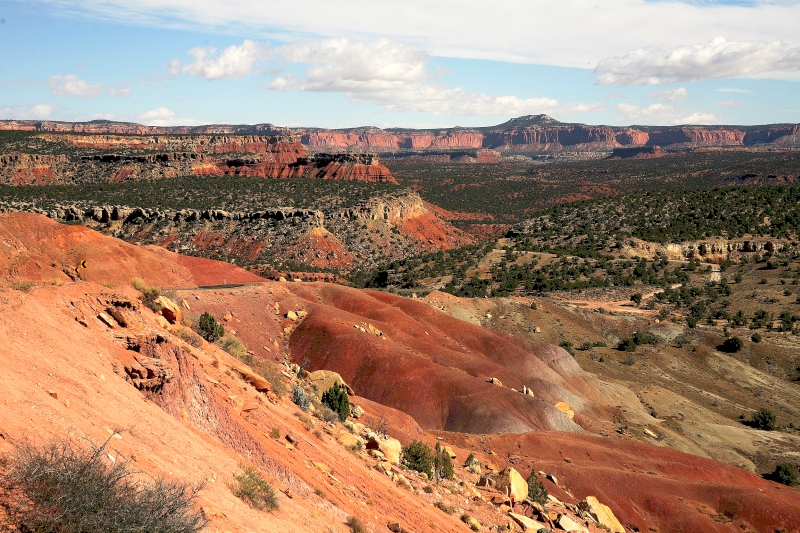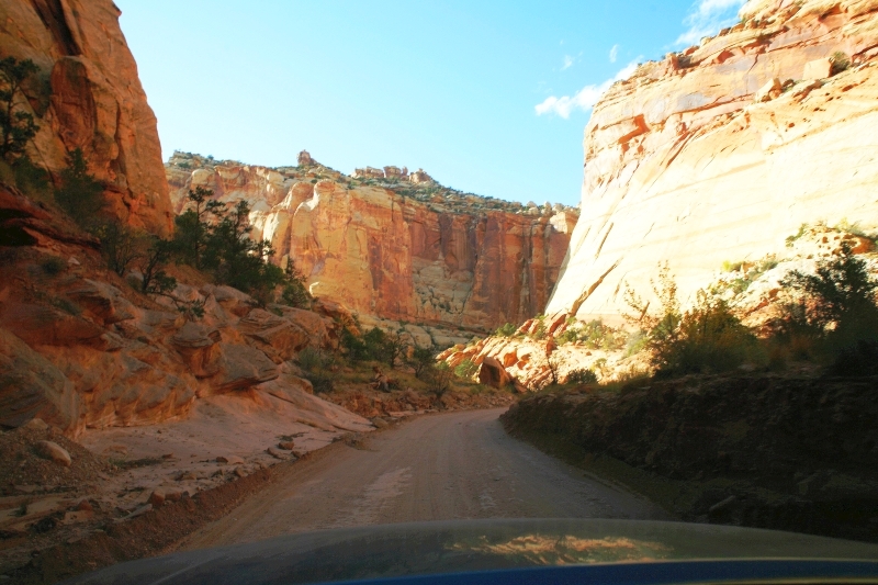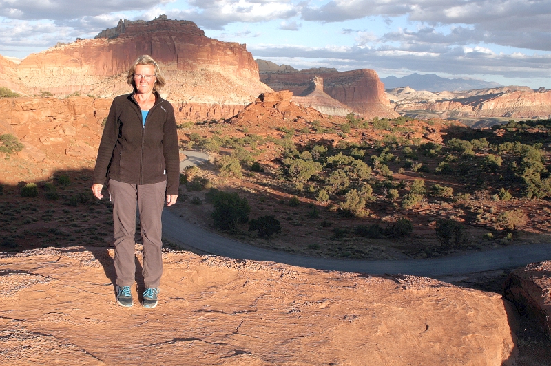 Über den aüßerst sehenwerten Highway 12, auch als "Scenic Byway" (also schöne Nebenstraße oder Straßen mit dem grünen Strich auf der Landkarte) bezeichnete Route, fahren wir nach Boulder. Dort beginnt der "Burr-Trail", der auf dem ersten Stück asphaltiert ist und durch eine grandiose Canyonlandschaft führt. Dann endet der feste Belag und das Ganze wird noch sehenswerter! Vor uns tut sich das "Capitol Reed" auf, ein riesigesüerirdisches Riff, das vor vielen Millionen Jahren noch unter Wasser lag. Diesen Blick von oben auf das Riff bekommt man nicht geboten, wenn man nur in den eigentlichen Nationalpark "Capitol Reef" fährt. Der Burr-Trail führt dann in spektakulären Kehren hinunter zur "Waterpocket-Fold". Der Riß in der Erdkruste ist gut 160 Kilometer lang und lässt noch heute ahnen, welche Kräfte am Werk waren. Die Staubpiste "Nottom.Bullfrog-Road" führt uns nach Norden und wir nähern uns dem Parkeingang. Durch den Nationalpark führt im Wesentlichen eine Straße, die später als Staubpiste durch hohe Felsschluchten führt. Der obligatorische Film im Visitorcenter erklärt Geologie und Geschichte der Region. Abends lassen wir uns an einem Aussichtspunkt von der sensationellen Bergkulisse in ihren Bann ziehen.