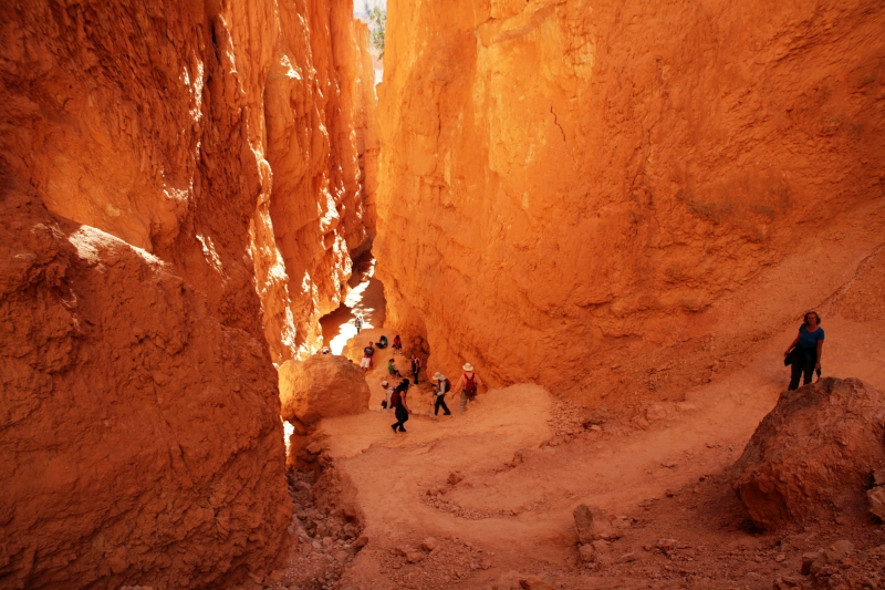 Der nächste Tag ist von der Landschaftsform her das genaue Gegenteil. In den engen "Narrows" am Ende Des Tales gehen die Felswände zu beiden Seiten steil nach oben, während unten der etwa 10° kalte Fluß des "Virgin River" den "Wanderweg" darstellt. Der Fluß ist der Weg! Im nächsten Leben sollten wir es als Schuhvermieter am Zion National Park versuchen. Fast jeder hat einen Spezial-Besenstiel zur Stabilisierung und diese "Narrows-Spezialschuhe" mit gelben Schnürsenkeln. In der Schlucht wachsen an den breiteren Stellen amerikanische Pappeln (das sind die, die im Herbst diese tollen Farbeffekte schaffen) und an den Felswänden wachsen die "hängenden Gärten". Wow!