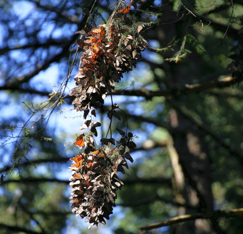 Sobald die Sonne am späten Vormittag genug Kraft hat, sind die Wiesen und Hänge voll von Faltern. Ein im Eintrittspreis enthaltener (haha ;-) ) Guide führt uns zu einem sehr kleinen Waldstück, in dem Abermillionen von Monarchfaltern in den Bäumen hängen und von hier aus auf Nahrungssuche gehen.