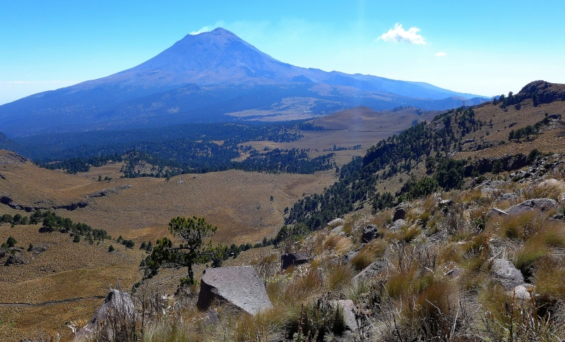 Nach wenigen hundert Höhenmetern erreichen wir den Cortez-Pass zwischen den Zwillingsvulkanen Popocatepetl und Iztaccihuatl. Der "Popo" ist allerdings noch aktiv und er raucht fleißig vor ich hin. Noch im März musste der Flughafen vom nahe gelegenen "Mexico"  wegen Ascheregen gesperrt werden (die Mexikaner sagen tatsächlich nur "Mexico" und nicht "Mexico-Stadt" oder so).
