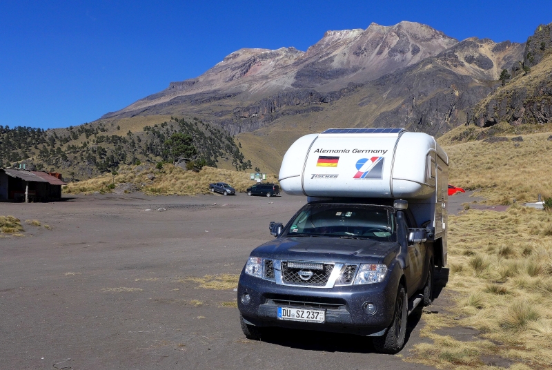 Eine FES-Spezialeinheit der mexikanischen Marines ist hier oben in den Bergen in einem riesigen Wohnwagen stationiert und passt auf, dass keiner die beiden Vulkane klaut. Eine Dreiergruppe muss heute auf den Izta aufpassen und ist zu Fuß auf den Weg dorthin. Die drei haben aber gar keine Lust auf die sieben Kilometer Staubpiste zu Fuß. Als sie uns lieb fragen, setzen wir Einen auf den Beifahrersitz und Margit geht mit den anderen Beiden samt Sturmgewehr in die Wohnkabine. Diesmal achten auch wir darauf, dass die drei nichts vergessen, so wie damals in der Türkei. Wir wollen schließlich nicht mit einer Waffe der mexikanischen Streitkräfte erwischt werden.