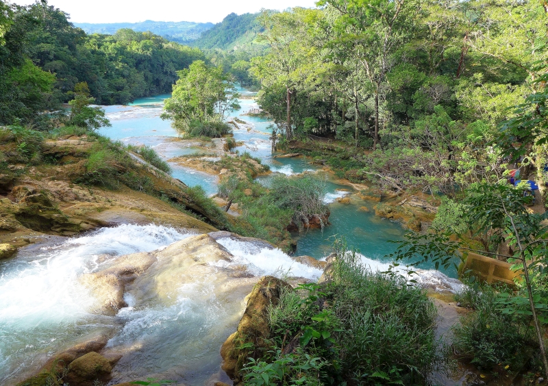 Topes und Kurven bis nach Auga Azul! Dort finden wir wirklich schöne Kaskaden und Schwimmbecken. Der Tourismus mit den immer gleichen Angeboten von bestickten Sachen zieht sich ebenfalls die Kaskaden hoch.
