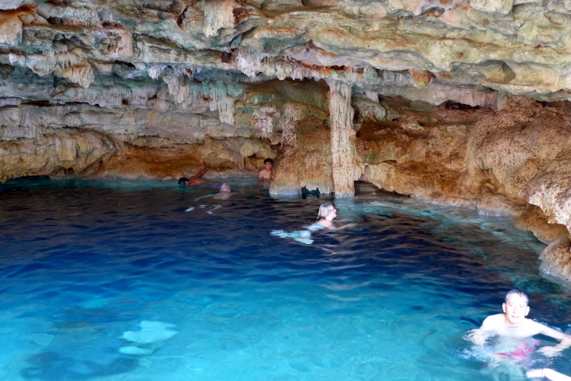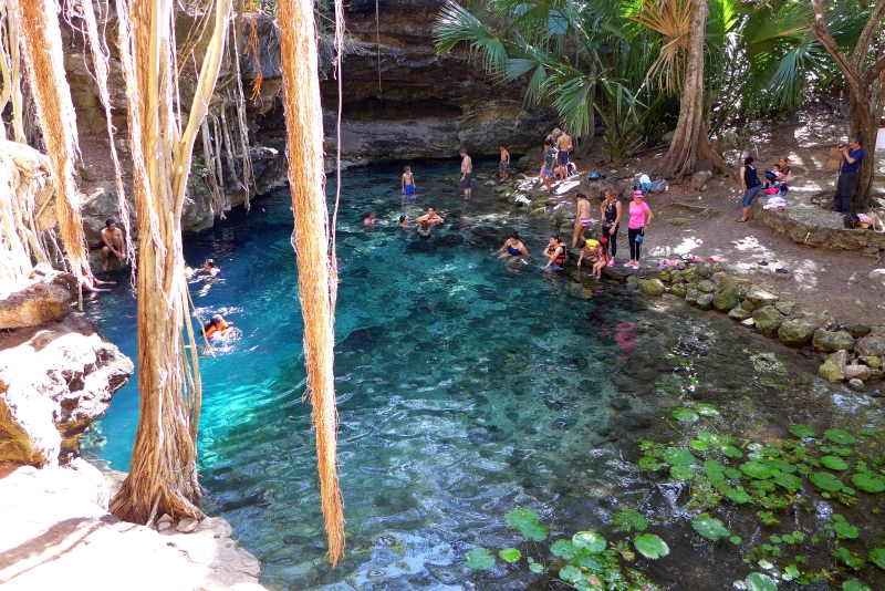 Zwischen Uxmal und Merida liegen beliebte Süßwasserbäder. Auf der Halbinsel Yucatan haben sich alle Flüsse in den Untergrund verabschiedet, alles ist durchlöchert. An den eingefallenen Stellen sind so genannte "Cenote" entstanden. Das sind Badegumpen in Löchern in der sonst so trockenen Gegend. Über 2000 Cenoten soll es auf der Halbinsel Yucatan geben. Die Pflanen haben Strategieen entwickelt, um das begherte Nass bis an die Oberfläche zu saugen. Das Baden in diesen Cenoten ist herrlich, weil sie eine angenehme Temperatur haben und kristallklar sind. Und jede Cenote hat einen komplett anderen Charakter, Mal ist es wie in einer Urwaldoase, mal schwimmt man in einer Tropfsteinhöhle.