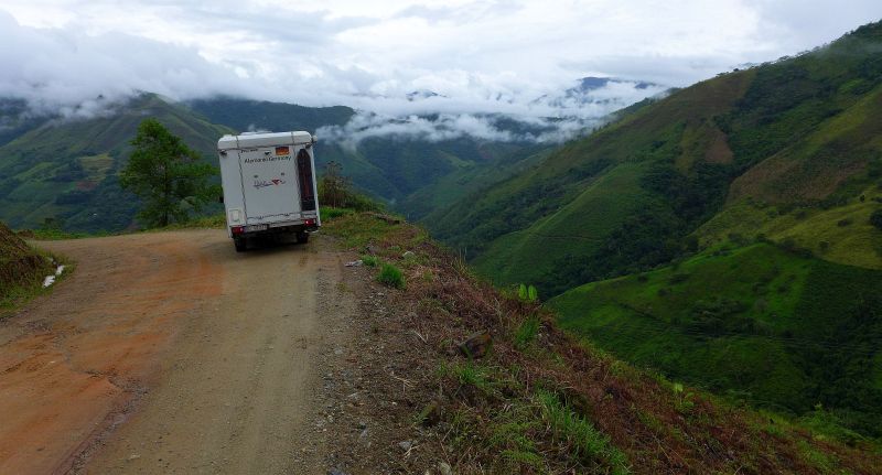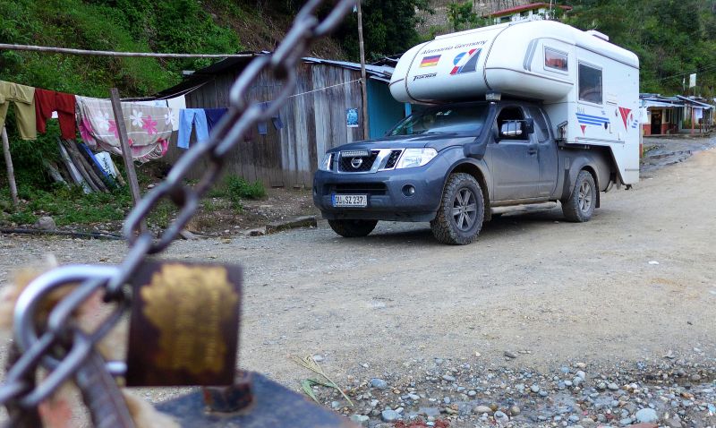 Bis zur Grenze ist es ein guter halber Tag. Immer wieder wird die Straße sehr schmal und  von nicht asphalierten Kurvenabschnitten unterbrochen. Etwa 25 Kilometer vor dem Ort "Zumba" hört die geschlossene Decke dann ganz auf. Bei Regen ist die Fahrt auf dieser einspurigen "Straße" an sich ein Abenteuer. Trotzdem kommen uns sogar "Schulbusse" entgegen! Das macht uns Hoffnung. Gelegentlich legen wir wegen der nassen, lehmigen Piste und der Gefahr seitlich abzurutschen den Allrad ein. Eine Flussdurchquerung weiter erreichen wir den Ort "Zumba". Oben tanken wir noch ein letztes Mal vor der Grenze Perus. Zu unserem Erstaunen gilt der staatlich festgesetzte Preis von 1,037 Dollar pro Gallone Diesel auch hier in der Abgeschiedenheit! Wir kaufen von den lieben Händlern hier oben noch einige Lebensmittel und machen uns auf die letzten, weniger schwierigen, aber ausgewascheneren 26 Kilometer zur Grenze. Zwischendurch ein freundlicher Militärposten, ansonsten ein einspuriger Feldweg in grandioser Landschaft!