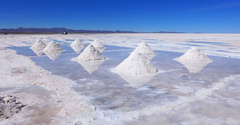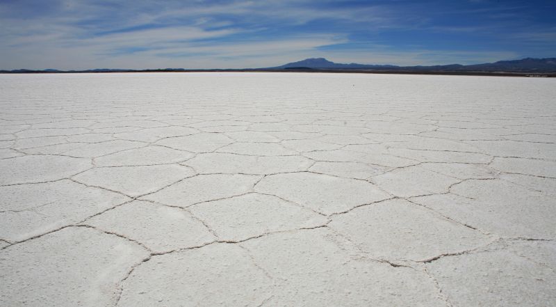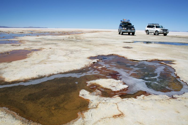 Bei Colchani erreichen wir den riesigen "Salar de Uyuni", ein - nein DER -  Salzsee auf etwa 3700 Metern über dem Meer. Der ganze Ort Colchani lebt vom Salz, während Uyuni von den Touristen zu leben scheint, die sich mit eienm Jeep auf den See fahren lassen. Von anderen reisenden haben wir gehört, dass der See noch vor kurzem aufgrund des Regens unbefahrbar gewesen sei. Als wir vorbeikommen, finden wir einen Teil trocken vor, den matschigen Teil muten wir unserem Auto nicht mehr zu, sondern greifen zu den Wanderschuhen. An einigen Stellen hat der See sogenannte "Ojos", wo man schnell mal einsinken kann und meist Wasser von unter hochsprudelt, wie in einer Karstquelle. Der Eindruck von Weite auf dem See ist unbeschreiblich. Uns faszinieren besonders die wabenartigen Strukturen der Salzränder, die beim Eintrocknen entstehen. Wir suchen einen bisher unbesuchten Teil des Sees (also ohne Reifenspuren) auf und ernten ein wenig von dem "Fleur de Sal" für unsere Küche.