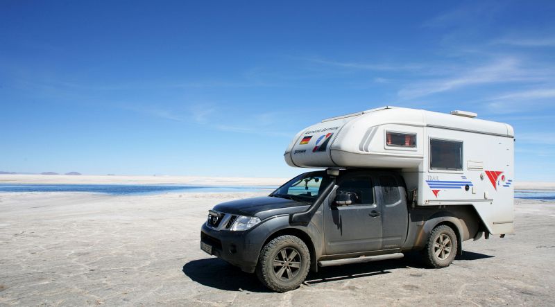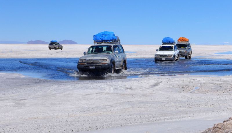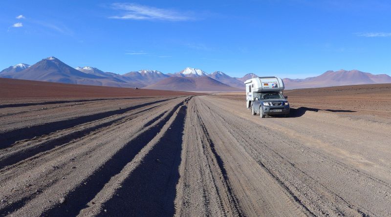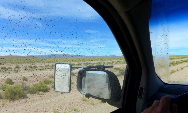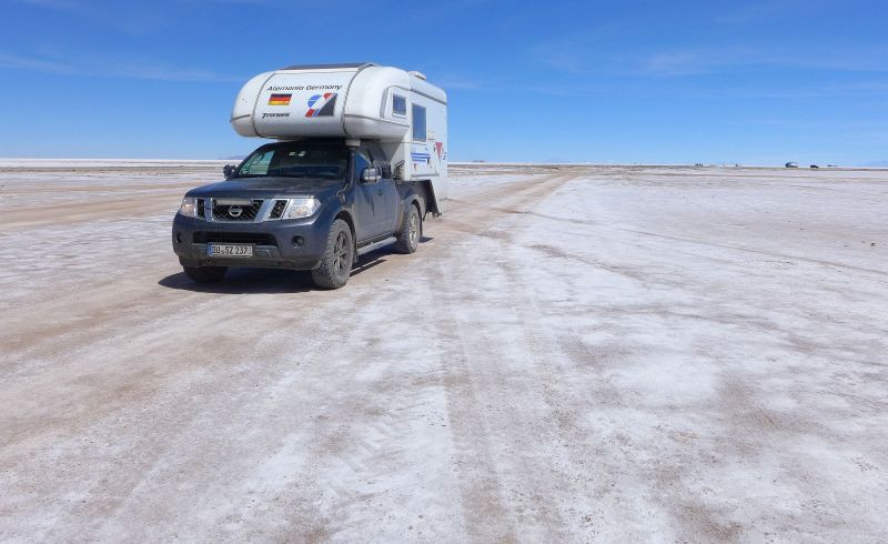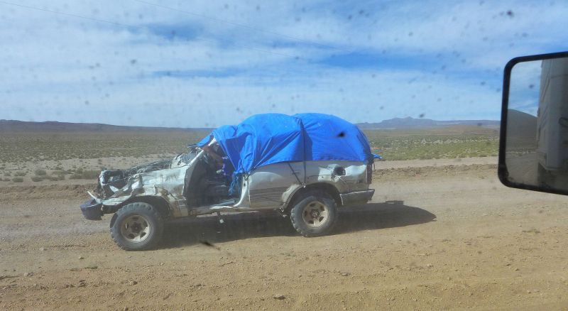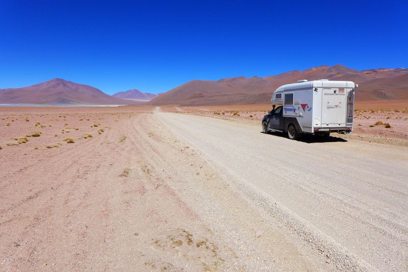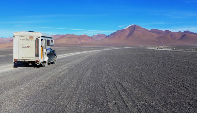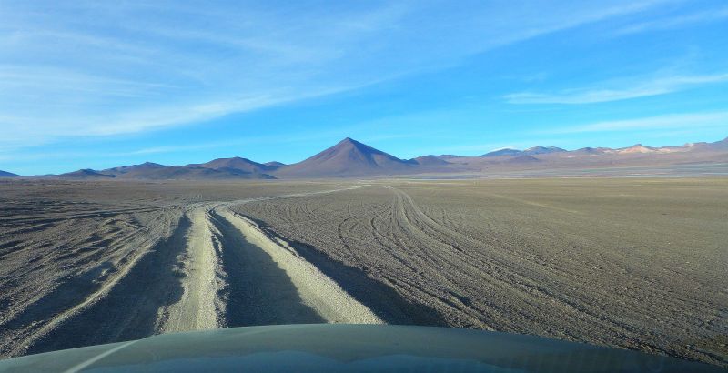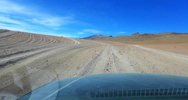 Es sind einige Pisten durch das Gebiet geschoben, doch die sind oft so schlecht, dass man irgendwo daneben her fährt. Jeder sucht sich die beste Spur und heraus kommen auf der über 400 Kilometer langen Strecke etliche Offroad-Kilometer. Die Nächte hier oben sind kalt, aber unser Motor springt auch in 4500 Meter nach klirrender Nacht bei minus zwölf Grad prima an. Dann geht es über eine einsame Staubstrecke steil hinauf und unser Wagen fängt an zu stottern. Das Problem scheint nach dem Luftfilterwechsel zunächst behoben, doch müssen wir später noch den Dieselfilter tauschen und den Vorfilter reinigen. Dabei hatten wir nur 60 Liter von dem berühmten bolivianischen Diesel zugetankt. Wir wollten eben mit vollem Tank auf diese Strecke.