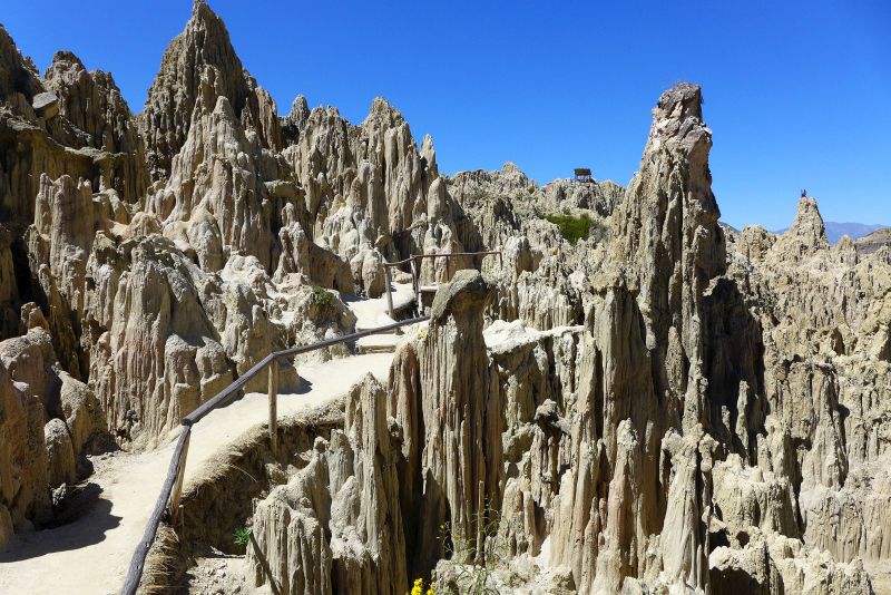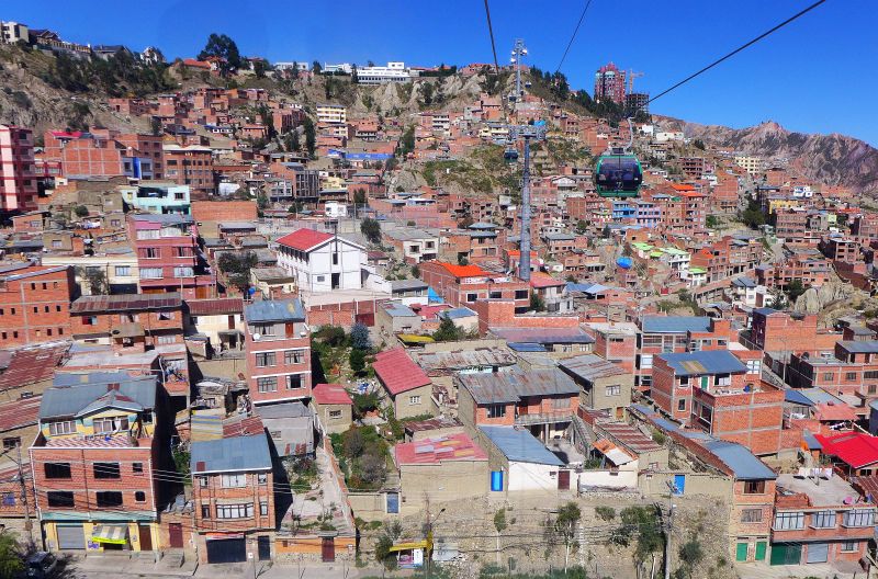 Dann laufen wir die Overlander-Adresse in La Paz an, das Hotel Oberland, das von einem Schweizer geführt wird und ein kleines Camping-Areal hat. Von dort aus besichtigen wir das "Valle de la Luna" und besichtigen die Stadt per Seilbahn! Ja richtig gehört! In La Paz ist das das wohl schnellste Transportmittel, auch wenn die Gondeln sich nur mit 14 km/h bewegen, denn es gibt innerstädtisch bis zu 700 Höhenmeter zu überwinden!!! Vier Linien sind in Betrieb und weitere werden von der Schweizer Firma Dopplmayer gebaut. Mit den schneebedeckten Bergen im Hintergrund kommt man sich fast vor wie im Skiurlaub, nur fährt man mitten über die Häuser der Stadt. Wir beobachten einen Spielzug eines Fußballspiels, eine Militärparade und sehen alles aus der Luft. Unglaublich! Mit den unverputzten Häusern im Deteil sicher nicht die schönste Stadt, aber die Lage macht La Paz für uns zu einem besonderen Erlebnis.