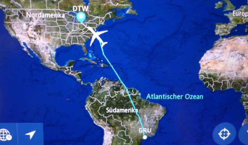 Darüber und über die vielen Stationen unserer Reise können wir beim Rückflug nachgrübeln. Was wird man uns fragen, wenn wir zurück kommen, was ist unser persönlicher Gewinnn an Erfahrungen? Vermutlich werden unsere Antworten jeweils unterschiedlich ausfallen, so viele unterschiedliche Aspekte hatte diese Reise. So verbringen wir kurze zweieinhalb Stunden in der Luft zwischen Montevideo und Sao Paulo, gefolgt von einem Aufenthalt von vier Stunden. Es folgt ein langer Nachtflug nach Detroit. Die Airline gibt sich große Mühe, uns für einen Nachtschlaf zufrieden zu stellen ;-) Dann dürfen wir tagsüber zehn Stunden in Detroit verweilen, bevor uns in der nächsten Nacht der Flieger von Detroit nach Frankfurt den Jetlag von sechs Stunden verpasst. Vom Frankfurt aus nehmen wir den Zug und sind voller Freude, als uns unsere Kinder und unser Enkel in den Arm schließen. Wir lassen uns sehr gerne mit einem tollen Grillnachmittag im Garten begrüßen. Es ist fast, als wäre man gar nicht weg gewesen - wäre da nicht diese Reise ...